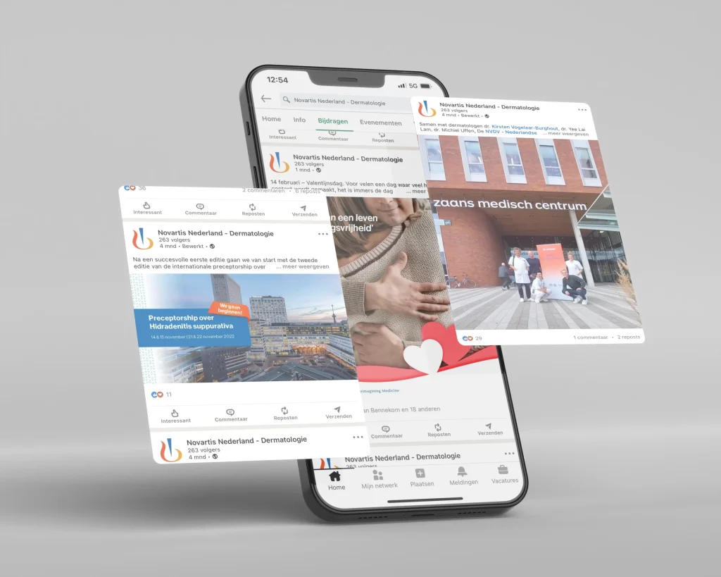 Novartis Dermatology wants to establish itself as a leading dermatological company on LinkedIn (among other places). It was important to strengthen the relationships with key stakeholders, expand the organisation’s role as a knowledge partner and raise awareness of the relevance of the Skin to Live in Academy.